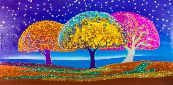 Eight years ago we sold the hobby shop, retired and moved to Bullville, New York and almost immediately Kathy and I became owners of RiverWinds Gallery in Beacon, NY, along with friend and fellow artist, Mary Ann Glass. I continued to paint and sell my photography and paintings at RiverWinds gallery. The last two years there, I started developing a new style of painting. I call it “large pointillism on steroids”, (glitter). It is lots of dots that make-up very colorful pictures. Mostly I do tree paintings and after adding glitter, my sales really took off.
